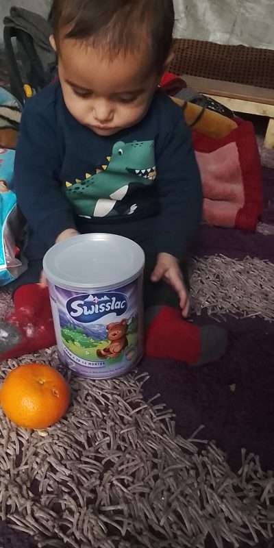 Hanan is a nine month old baby girl who lives in a tent with her parents. They have been displaced multiple times. Her mother, Warda, struggles to feed, diaper, and adequately clothe her.